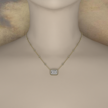 This is a chic and classy set of layered necklaces with a thick chain choker with bare chain pieces and diamond-studded chain pieces, and two long diamond charm necklaces.